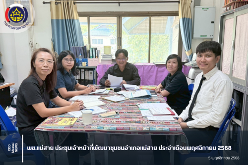 นายประเสริฐ ขันทะ พัฒนาการอำเภอแม่สาย พร้อมด้วยเจ้าหน้าที่พัฒนาชุมชนอำเภอแม่สาย ร่วมประชุมประจำเดือนพฤศจิกายน 2568 เพื่อวางแผน ขับเคลื่อน และติดตามความก้าวหน้าการดำเนินงานตามภารกิจของกรมการพัฒนาชุมชน รวมถึงงานตามนโยบายของจังหวัด รัฐบาล และภารกิจอื่นที่เกี่ยวข้อง เพื่อให้การดำเนินงานบรรลุตามเป้าหมายอย่างมีประสิทธิภาพ