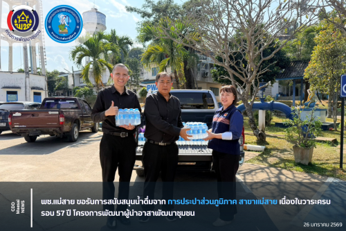 สำนักงานพัฒนาชุมชนอำเภอแม่สาย นำโดย นางประพิมพา วัฒนา พัฒนาการอำเภอแม่สาย ขอรับการสนับสนุนน้ำดื่มจากการประปาส่วนภูมิภาค สาขาแม่สาย จำนวน 120 ขวด เพื่อใช้ในการจัดกิจกรรมเนื่องในวาระครบรอบ 57 ปี โครงการพัฒนาผู้นำอาสาพัฒนาชุมชน (ผู้นำ อช.) ประจำปีงบประมาณ พ.ศ. 2569