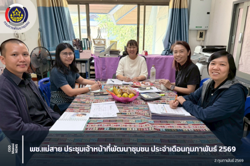สำนักงานพัฒนาชุมชนอำเภอแม่สาย โดยนางประพิมพา วัฒนา พัฒนาการอำเภอแม่สาย พร้อมด้วยเจ้าหน้าที่สำนักงานพัฒนาชุมชนอำเภอแม่สาย ดำเนินการประชุมเจ้าหน้าที่พัฒนาชุมชน ประจำเดือนกุมภาพันธ์ 2569 เพื่อทบทวนผลการดำเนินงานที่ผ่านมา ทั้งด้านความสำเร็จและปัญหาอุปสรรคในการปฏิบัติงาน รวมถึงร่วมกันวางแผนการขับเคลื่อนภารกิจงานพัฒนาชุมชนในระยะต่อไป