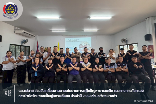 พช.แม่สาย ร่วมขับเคลื่อนงานตามนโยบายการแก้ไขปัญหายาเสพติด แนวทางการคัดกรอง/การบำบัดรักษาและฟื้นฟูสภาพสังคม ประจำปี 2569 ตำบลเวียงพางคำ